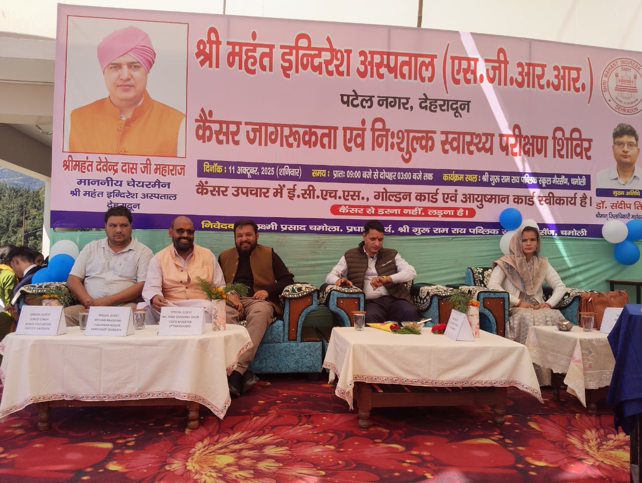 देहरादून। श्री महंत इन्दिरेश अस्पताल, देहरादून के सौजन्य से श्री गुरु राम राय पब्लिक स्कूल, गैरसैंण में शनिवार, 11 अक्टूबर 2025 को कैंसर जागरूकता एवं निःशुल्क स्वास्थ्य परीक्षण शिविर का सफल आयोजन किया गया। इस अवसर पर 3002 से अधिक मरीजों ने शिविर का लाभ उठाया। शिविर में अस्पताल के विशेषज्ञ चिकित्सकों ने स्वास्थ्य परामर्श दिया तथा रोगियों को निःशुल्क दवाइयाँ वितरित की गईं।