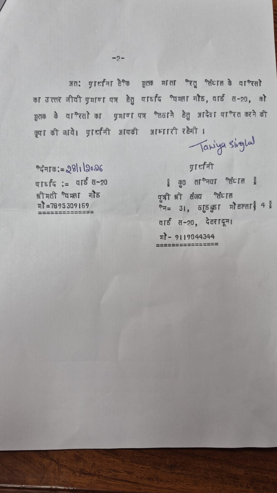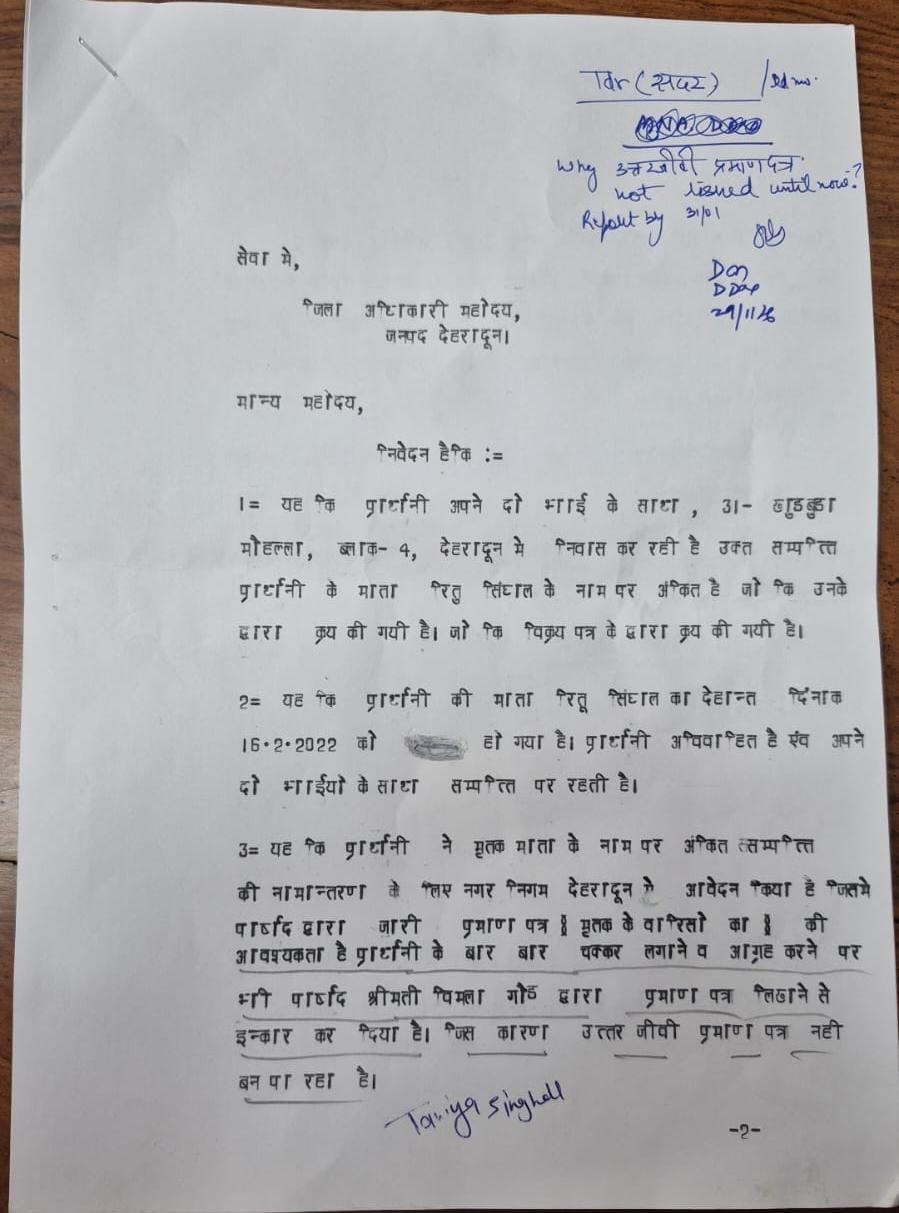 देहरादून : माता के निधन के उपरांत विगत चार वर्षों से उत्तरजीवी प्रमाण पत्र हेतु विभिन्न कार्यालयों के चक्कर लगा रही तान्या सिंघल को जिला प्रशासन की त्वरित कार्रवाई से राहत मिली है। खुड़बुड़ा निवासी तान्या सिंघल ने जिलाधिकारी को प्रार्थना-पत्र प्रस्तुत कर अवगत कराया कि उनकी माता का निधन दिसंबर 2022 में हो गया था। नगर निगम के संपत्ति रजिस्टर में अपना नाम दर्ज कराने हेतु उन्हें उत्तरजीवी प्रमाण पत्र की आवश्यकता थी। उन्होंने बताया कि वह लंबे समय से परेशान थीं और विभिन्न स्तरों पर प्रयास करने के बावजूद समाधान नहीं हो पा रहा था।
