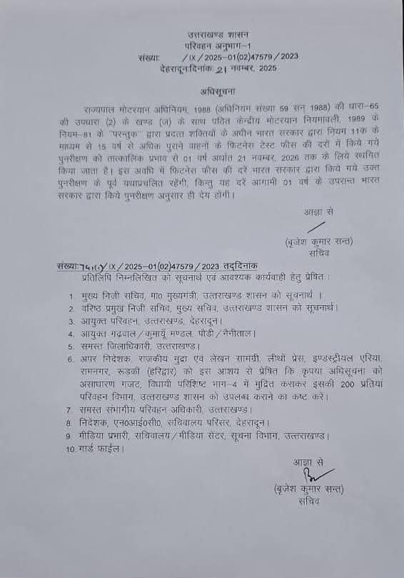 देहरादून : मुख्यमंत्री पुष्कर सिंह धामी के निर्देश पर राज्य सरकार ने उत्तराखंड के वाहन स्वामियों को महत्वपूर्ण राहत प्रदान करते हुए पुराने (15 वर्ष) कमर्शियल वाहनों की फिटनेस फीस में वृद्धि को आगामी 01 जुलाई 2026 तक स्थगित कर दिया है। इस संबंध में परिवहन विभाग द्वारा अधिसूचना जारी कर दी गई है। अधिसूचना सचिव परिवहन बृजेश कुमार संत द्वारा जारी की गई।