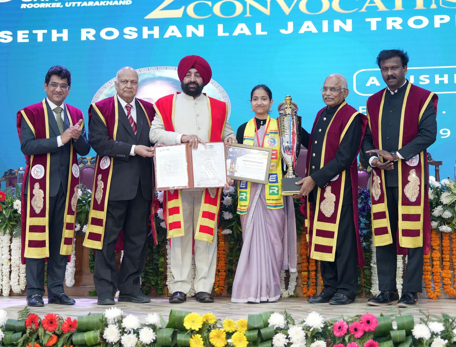 दीक्षांत समारोह में सेठ रोशन लाल जैन ट्रॉफी तीन विद्यार्थियों आयुषी पंवार (बी. कॉम ऑनर्स, 2022-25) को विश्वविद्यालय स्तर पर उच्चतम 9.9 सीजीपीए प्राप्त करने के लिए, डोना चौहान (डिप्लोमा इन सिविल इंजीनियरिंग, 2023-25) को 9.16 सीजीपीए हासिल करने के लिए और हनी चौधरी (एमसीए, 2023-25) को 9.5 सीजीपीए हासिल करने के लिए दी गई।