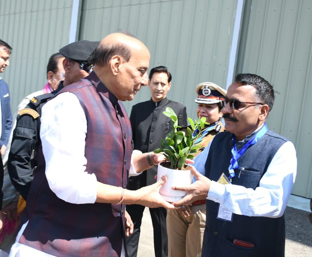 हल्द्वानी : जनपद नैनीताल के हल्द्वानी आगमन पर रक्षामंत्री राजनाथ सिंह के आर्मी हैलीपेड हल्द्वानी आगमन पर सांसद अजय भटट, पुलिस महानिदेशक दीपक सेठ, आयुक्त/सचिव मुख्यमंत्री दीपक रावत,पुलिस महानिरीक्षक रिद्विम अग्रवाल, जिलाधिकारी ललित मोहन रयाल एवं विभिन्न जनप्रतिनिधियों द्वारा उनका स्वागत किया गया साथ ही एरोड्रम रोड से एमबी इन्टर कालेज कार्यक्रम स्थल तक महिलाओं, स्थानीय लोगों ने पारम्परिक परिधानों में, स्थानीय लोक सांस्कृतिक कलाकारों द्वारा छोलिया नृत्य, झोडाचाचरी गीतोें के माध्यम से रक्षा मंत्री का स्वागत किया। इस दौरान सीमान्त क्षेत्र के रंग समुदाय के लोगों द्वारा अपनी पारम्परिक परिधानों के द्वारा रक्षा मंत्री का स्वागत किया गया।