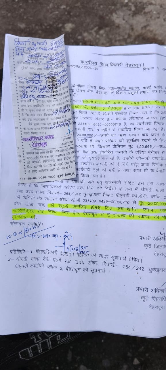 दो बेटो की मॉ व्यथित विधवा माला देवी ने डीएम ने फरियाद लगाई की उनके पति स्व उदय शंकर द्वारा कैनफिन लि0 से रू0 20 लाख का ऋण मकान क्रय करने के लिए लिया गया था जिसका बीमा भी कराय गया है रू0 12.22 लाख किस्त भी जमा कराई गई हैं किन्तु पति की मृत्यु 20 जनवरी 2025 को हो गई थी, पति की मृत्यु के उपरान्त इश्योंरेश कम्पनी व बैंक के पास मकान के दस्तावेज हैं कम्पनी द्वारा कोई कार्यवाही नही की गई है उनको परेशान किया जा रहा है उनके 2 नौनिहालों की पढाई भी बाधित हो रही है बैंक और इंश्योरेंश कम्पनी परेशान कर रही हैं जिस पर जिलाधिकारी ने केनफिन होम लि0 जीएमएस रोड के प्रबन्धक की रू0 22 लाख की आरसी काट दी है।