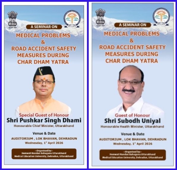 देहरादून : चारधाम यात्रा को सुरक्षित और व्यवस्थित बनाने की दिशा में कल बुधवार 1 अप्रैल को लोकभवन देहरादून में एक महत्वपूर्ण कार्यक्रम आयोजित किया जा रहा है। एचएनबी उत्तराखंड मेडिकल एजुकेशन यूनिवर्सिटी द्वारा “चारधाम यात्रा के दौरान मेडिकल समस्याएं एवं सड़क दुर्घटना सुरक्षा उपाय” विषय पर यह कार्यक्रम लोक भवन ऑडिटोरियम में सुबह 11 बजे से शुरू होगा। इसमें शासन, प्रशासन और चिकित्सा क्षेत्र के विशेषज्ञ एक मंच पर नजर आएंगे। कार्यक्रम में उत्तराखंड के राज्यपाल मुख्य अतिथि के रूप में शामिल होंगे। वहीं मुख्यमंत्री पुष्कर सिंह धामी और स्वास्थ्य मंत्री सुबोध उनियाल भी कार्यक्रम को संबोधित करेंगे। इस दौरान सरकार की ओर से चारधाम यात्रा को सुरक्षित और सुव्यवस्थित बनाने के लिए उठाए जा रहे कदमों की जानकारी दी जाएगी। कार्यक्रम की शुरुआत पंजीकरण प्रक्रिया से होगी। राज्यपाल के आगमन पर वंदे मातरम् और राष्ट्रगान के साथ औपचारिक शुभारंभ किया जाएगा। इसके बाद दीप प्रज्वलन किया जाएगा। विश्वविद्यालय के कुलपति प्रो. (डॉ.) भानु दुग्गल स्वागत भाषण देंगी और कार्यक्रम की रूपरेखा तथा उद्देश्यों पर विस्तार से प्रकाश डालेंगे।