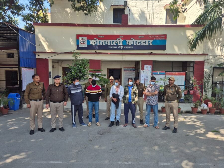 झंडा चौक, कोटद्वार क्षेत्र में युवकों के मध्य मारपीट एवं गाली-गलौच की सूचना प्राप्त होते ही पुलिस मौके पर पहुँची। मौके पर पाँच व्यक्ति आपस में झगड़ते पाए गए, जिनमें कुछ को आपसी हाथापाई में चोट भी आई थी। प्रकरण की गंभीरता को दृष्टिगत रखते हुए शांति व्यवस्था बनाए रखने हेतु संबंधित पाँचों व्यक्तियों नवीन जायसवाल पुत्र दानवीर सिंह, उम्र 35, निवासी कोडिया कोटद्वार जनपद पौड़ी, अभिषेक काला पुत्र चंद्र मोहन काला, उम्र 27 वर्ष, निवासी तेलीवाडा थाना नजीबाबाद यूपी, ज्योति चौधरी पुत्र हरी सिंह चौधरी, उम्र 50, वर्ष निवासी मालवीय उद्यान कोटद्वार जनपद पौड़ी, वरुण उर्फ जुन्नु पुत्र सुनील कश्यप, उम्र 26, निवासी गंगाधर जोशी मार्ग कोटद्वार जनपद पौड़ी व अनिल नेगी पुत्र गोपाल सिंह नेगी, उम्र 53 वर्ष, निवासी गोविंद नगर कोटद्वार जनपद पौड़ी को धारा 170 बीएनएसएस के अंतर्गत गिरफ्तार किया गया । गिरफ्तार व्यक्तियों को न्यायालय में पेश किया जा रहा है।