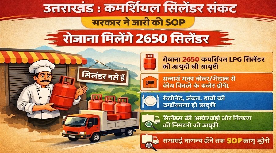 देहरादून: उत्तराखंड में व्यावसायिक एलपीजी सिलिंडरों की कमी से पर्यटन व्यवसाय प्रभावित होने की आशंका के बीच राज्य सरकार ने बड़ी राहत दी है। खाद्य, नागरिक आपूर्ति एवं उपभोक्ता मामले विभाग के सचिव आनंद स्वरूप ने कमर्शियल गैस सिलिंडरों की आपूर्ति के लिए मानक संचालन प्रक्रिया (एसओपी) जारी कर दी है। इस एसओपी के तहत प्रदेश में प्रतिदिन कुल 2650 व्यावसायिक एलपीजी सिलिंडर उपलब्ध कराए जाएंगे, ताकि शीतकालीन पर्यटन और आगामी चारधाम यात्रा के दौरान होटल, रेस्टोरेंट, ढाबे और अन्य प्रतिष्ठान प्रभावित न हों।