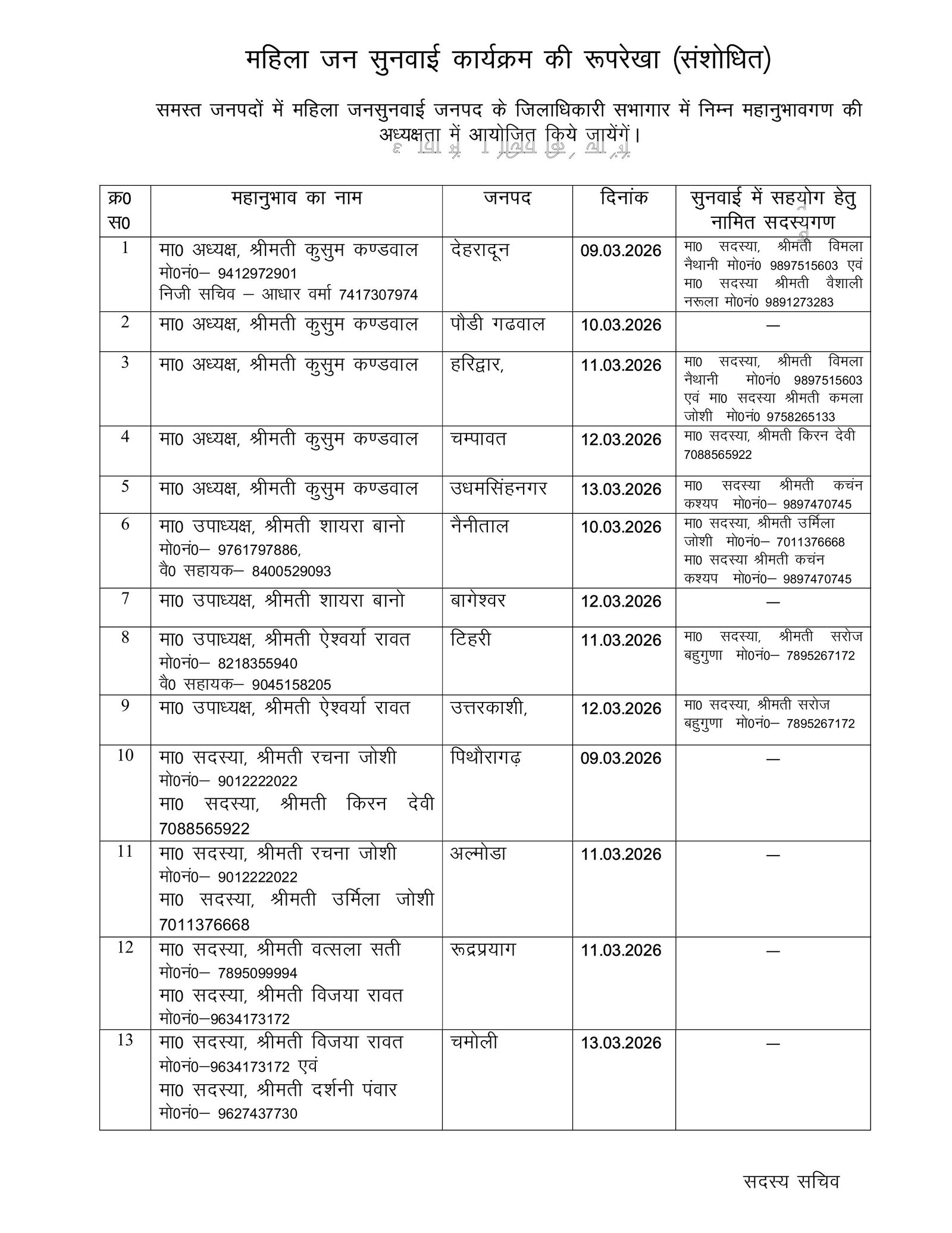 ​अंत में अध्यक्ष कुसुम कंडवाल ने प्रदेश की समस्त महिलाओं से अपील की है कि वे निर्धारित तिथियों पर आयोजित होने वाली इन जनसुनवाई में निर्भीक होकर प्रतिभाग करें और अपनी समस्याओं व लंबित प्रकरणों को आयोग के समक्ष रखें।